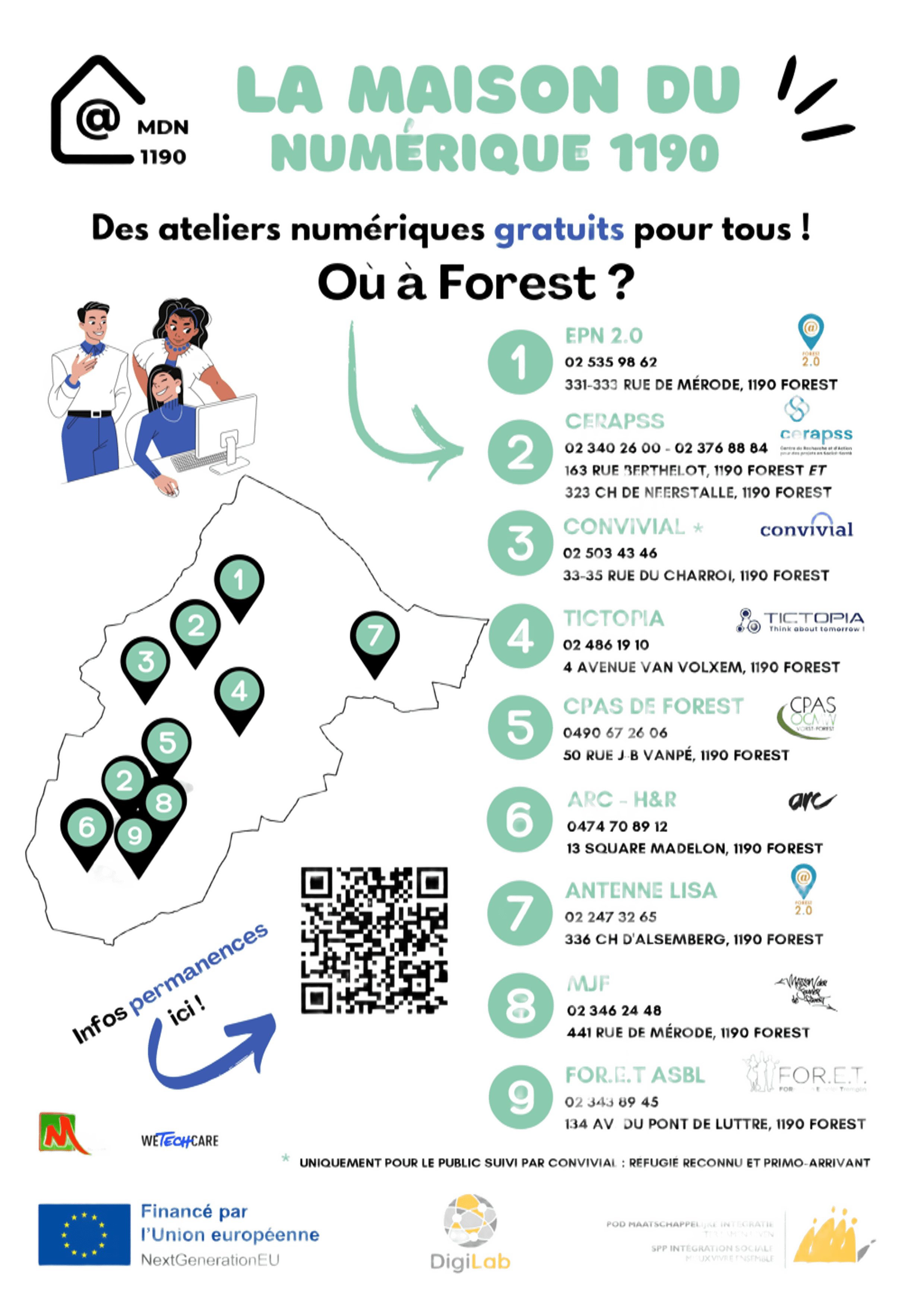 La Maison du numérique 1190 a donc été créée via un partenariat entre le CPAS, la Commune de Forest, L’asbl Convivial, l’asbl CERAPSS et la srcl Tictopia.Afin d’être au plus près du public, des permanences ont été ouvertes chez ces différents partenaires.